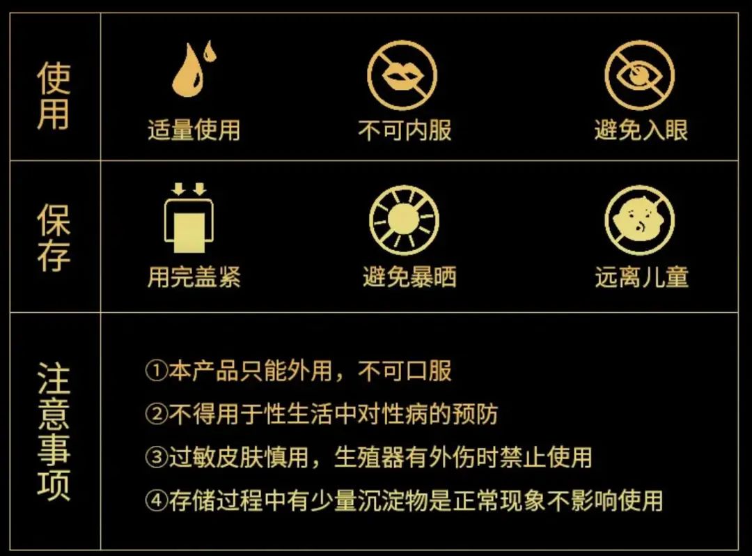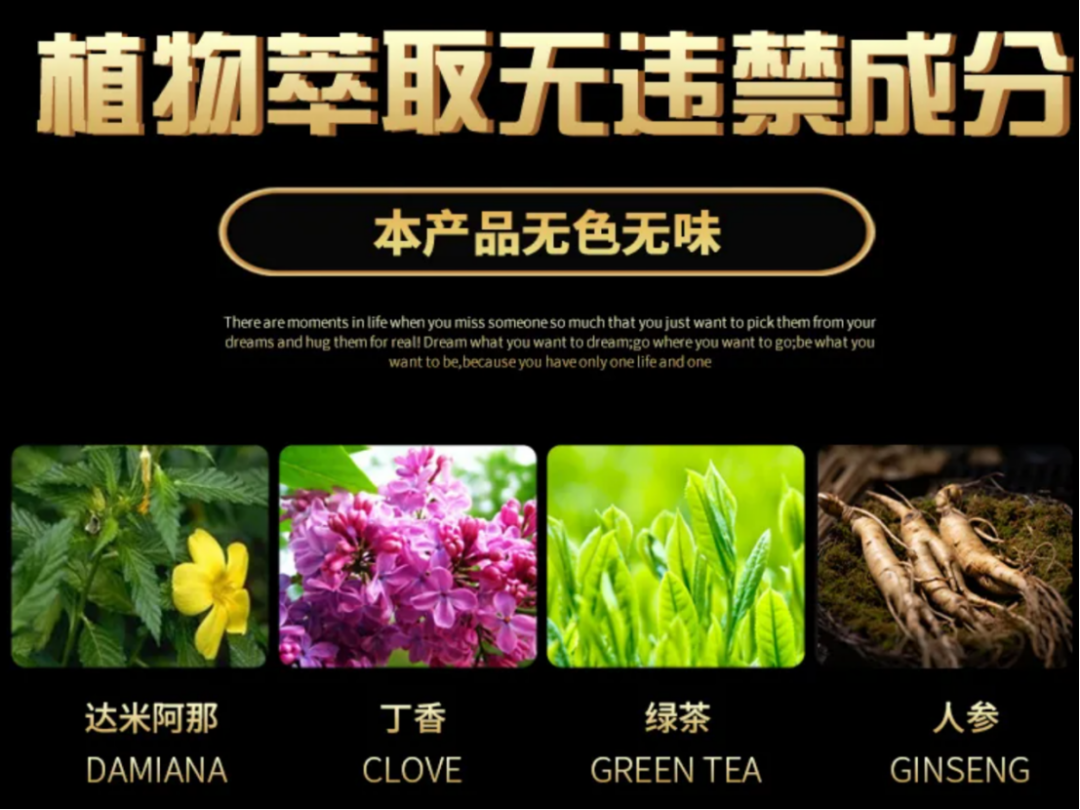 植物成分:精选达米阿那、丁香、绿茶、人参等植物天然植物提取物,无色无味,温和植物配方,不刺激尿道口。配方长期使用无依赖,植物萃取无违禁成分。