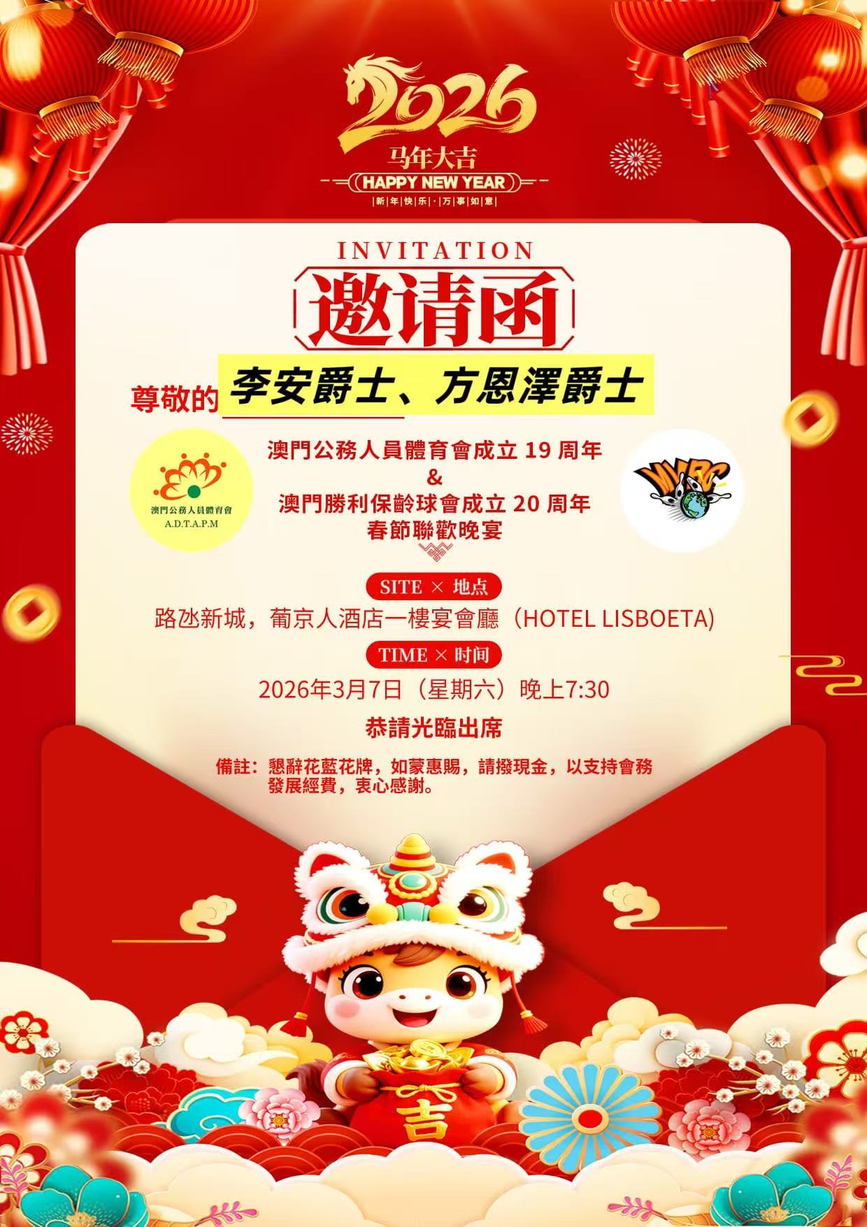 2026年3月7日晚,一场意义非凡的联合庆典——**澳门公务人员体育会成立19周年**暨**澳洲胜利保龄球会成立20周年春节联欢晚宴**隆重举行。